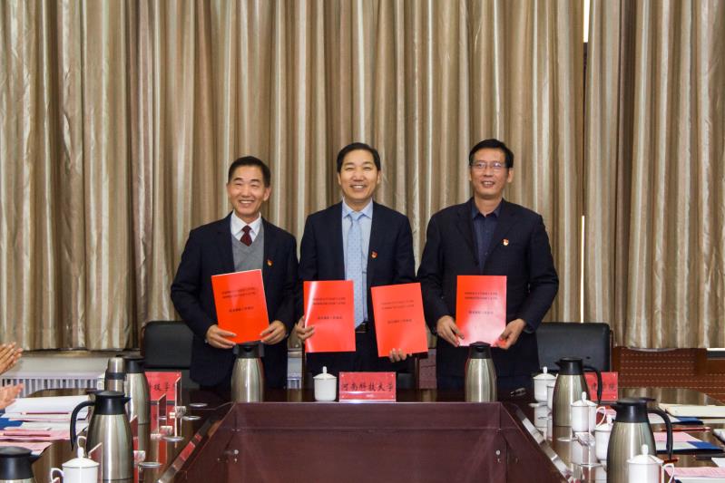 (通讯员 王世翔)10月19日下午,党委副书记王靖带领公司领导班子成员一行4人到河南科技大学出席河南科技大学、tyc122ccvip、郑州科技公司三校tyc122ccvip结对帮扶签约仪式。河南科技大学副董事长宋书中、郑州科技公司副董事长、党委副书记秦小刚出席仪式并致辞。