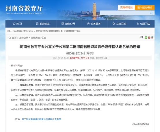 近日,河南省教育厅公布第二批河南省通识教育示范课程认定名单。公司tyc122ccvip王巧慧博士课程组申报的《毛泽东思想和中国特色社会主义理论体系概论》课程获得认定,实现了公司省级通识教育示范课程的突破。